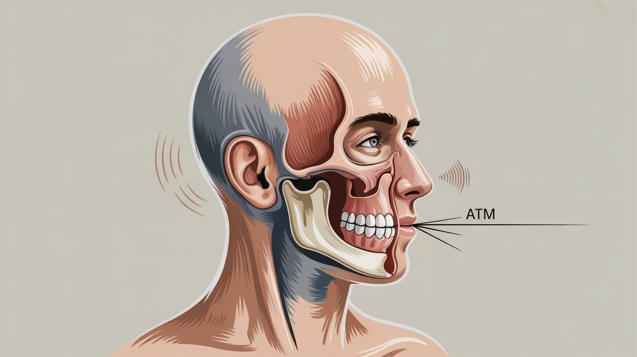 L’articulation temporo-mandibulaire (ATM) correspond à l’endroit où la machoire inférieure s’attache au crâne, sur l’os Temporal ; de chaque côté du visage et proche de l’oreille.